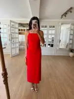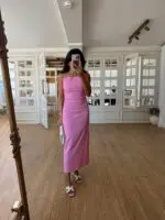 Ony Kırmızı-Pembe Desenli Sırtı Açık İp Kuşaklı Elbise
