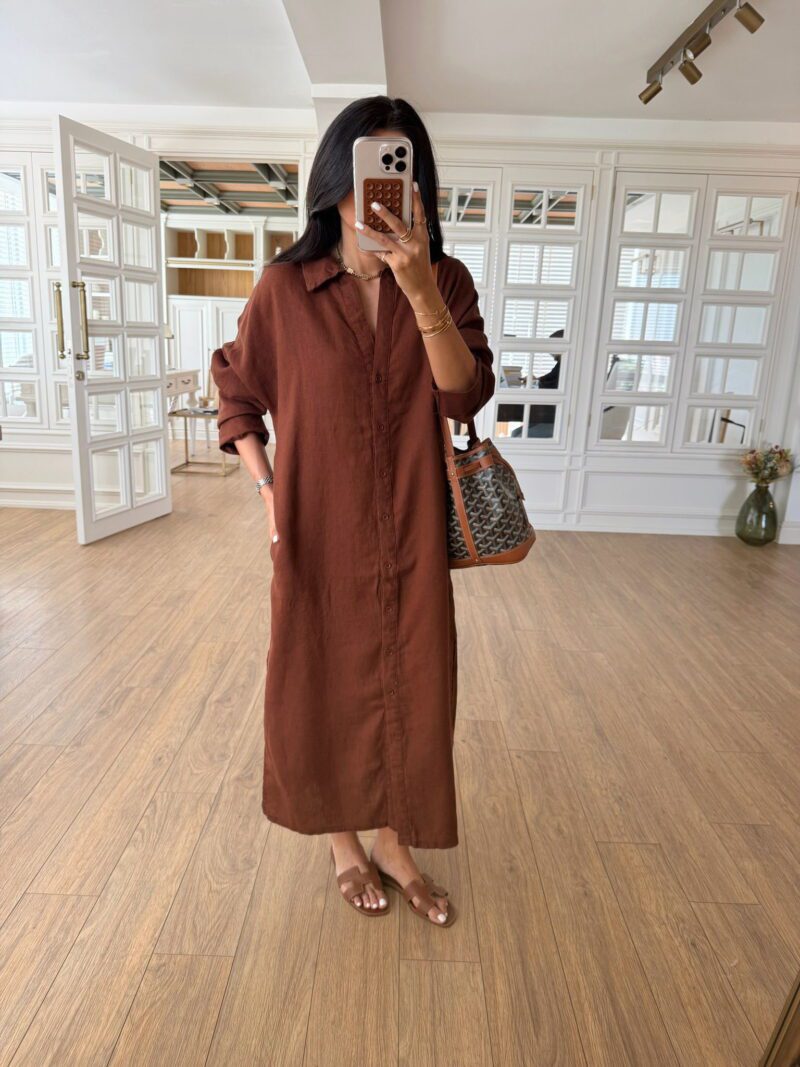 Berno Turuncu Bağlama Detaylı Boydan Düğmeli Gömlek Yaka Mini Elbise